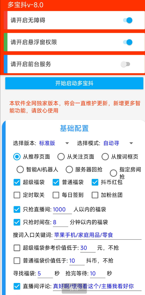 自动抢福袋功能,能够监控抖音平台上的福袋活动并在新福袋出现时迅速抢取